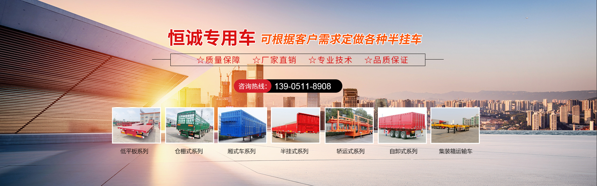 現(xiàn)有半掛車生產(chǎn)線,自卸車生產(chǎn)線,低平板生產(chǎn)線,轎運(yùn)車生產(chǎn)線,垃圾車,洗掃車,清洗車,超大件運(yùn)輸及特種車輛等100多種產(chǎn)品,可按需定制化生產(chǎn),滿足個性化需求。全方位服務(wù)以及售后優(yōu)勢